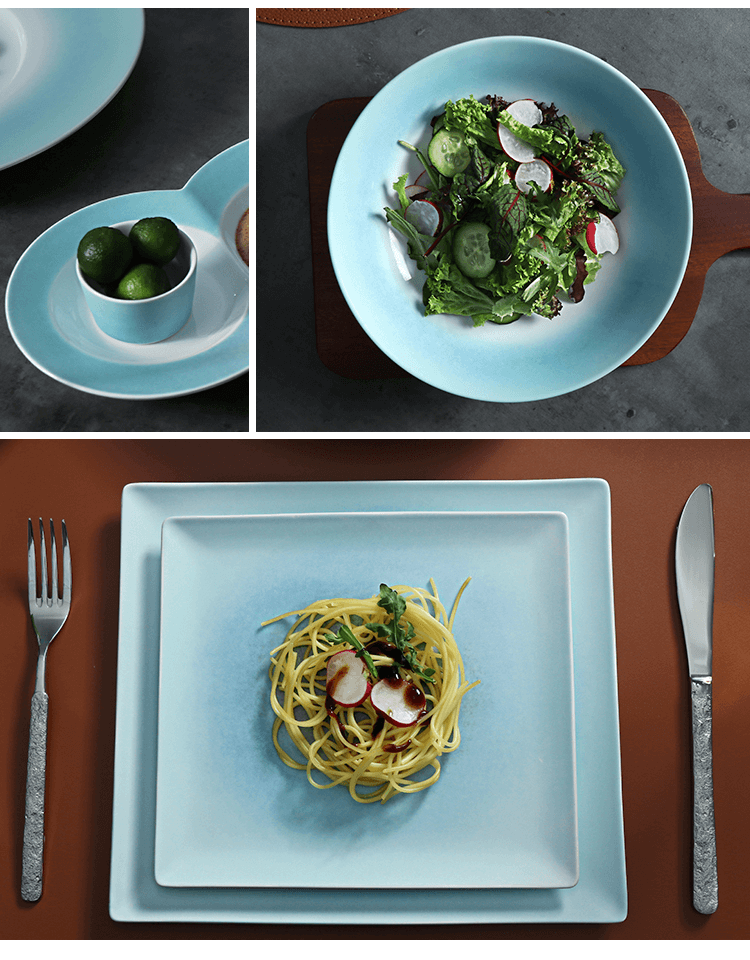 لوحات سيراميك تشاوتشو مجموعات أواني مائدة إيطالية طقم عشاء من الأواني الفخارية الفرنسية غير اللامعة مع لوازم الفنادق على لوحة الشموع.
