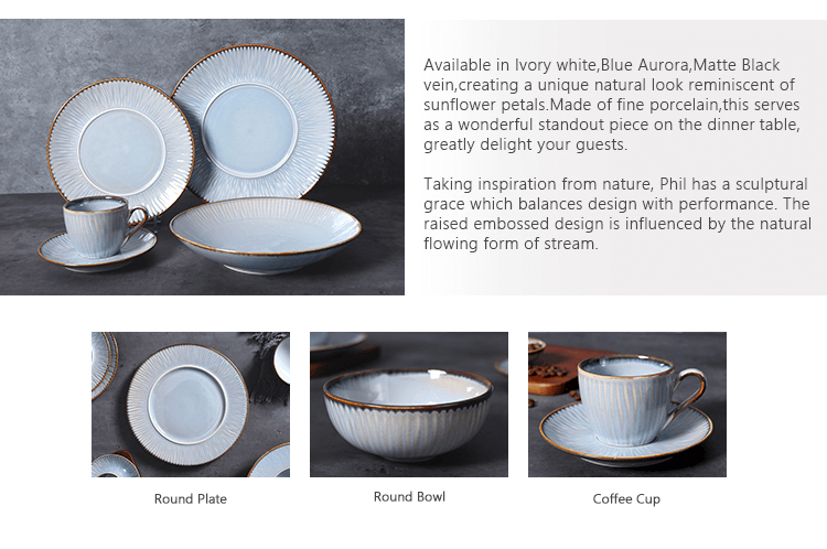 متوفر باللون الأبيض العاجي ، الأزرق أورورا ، الوريد الأسود غير اللامع ، مما يخلق مظهرًا طبيعيًا فريدًا يذكرنا بتلات عباد الشمس. مصنوع من البورسلين الفاخر ، وهو بمثابة قطعة بارزة رائعة على مائدة العشاء ، ويسعد ضيوفك كثيرًا.مستوحى من الطبيعة ، يتمتع Phil بنعمة نحتية توازن بين التصميم والأداء.يتأثر التصميم البارز المنقوش بشكل التدفق الطبيعي للتيار.
